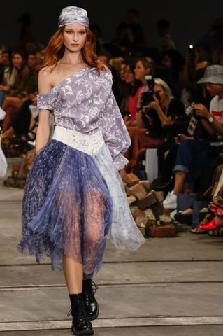 The influences and inspiration for the collection were clear, through the use of soft and fluid fabrics with strong tailoring, pleating and layering. There were high collars, synched waists and bell sleeves, contrasted with bright vivacious colours of red, green, and the signature ‘Ms. Moonlight’ purple. There was a recurring trend of using scarves as accessories on the arms, hair and heads of the models. One particular look included a scarf tied across a single boot, which was an interesting styling touch that we will no doubt see on influencers shortly.